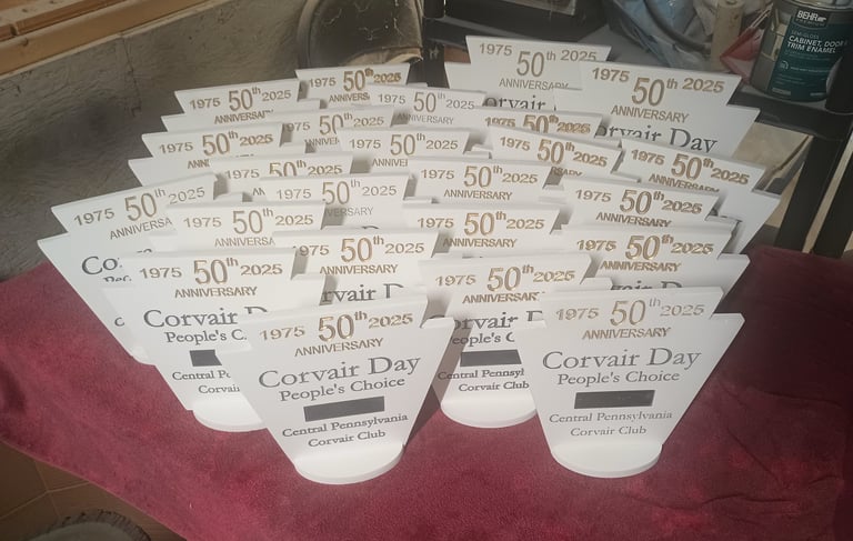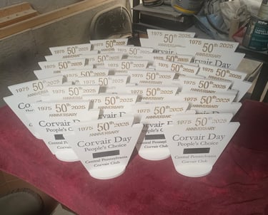 We can make trophies or plaques for your next competition or show. These were made on white PVC with black and gold lettering. They also included a metal plate that was customized with each winner's name and car model.